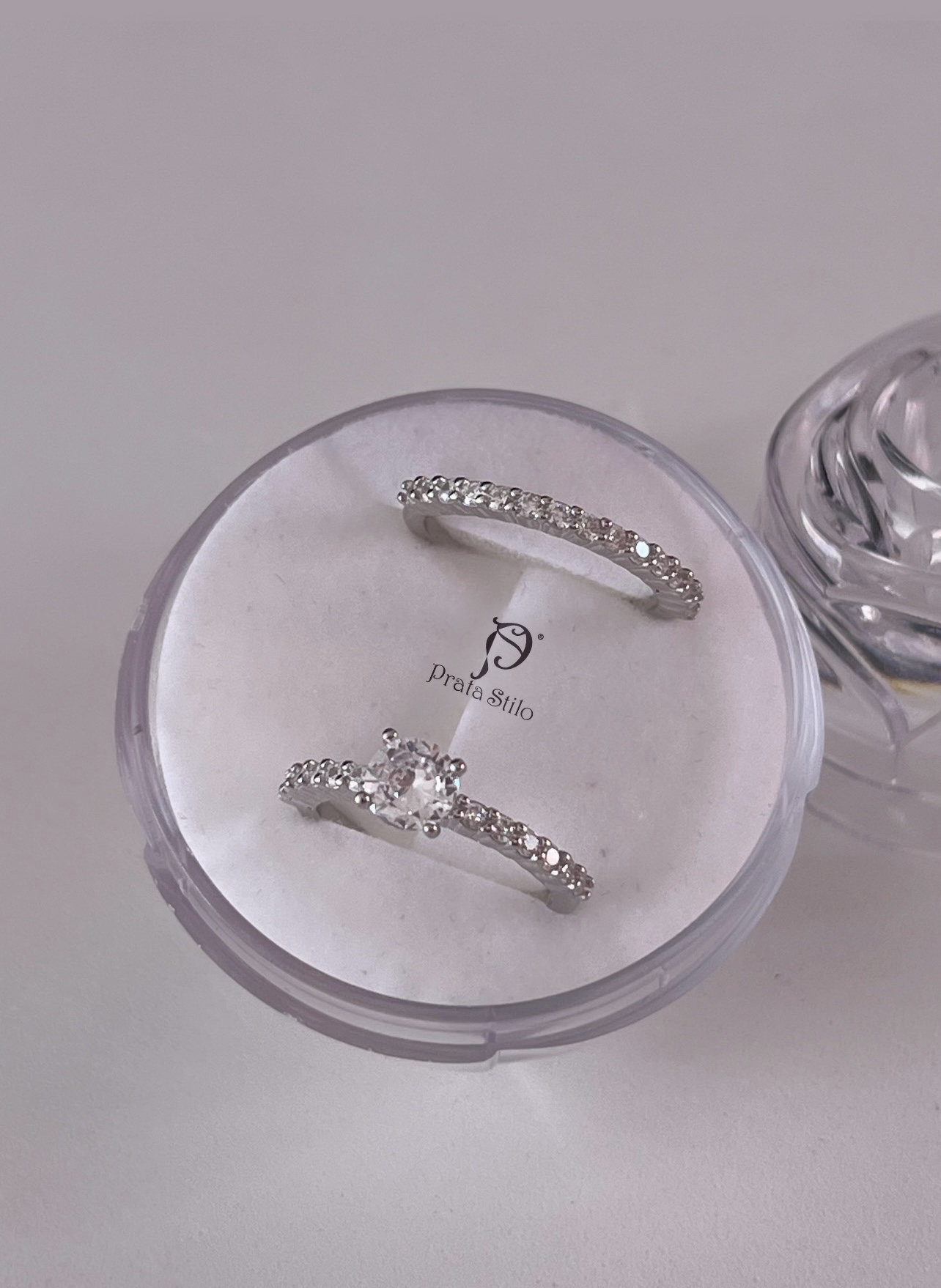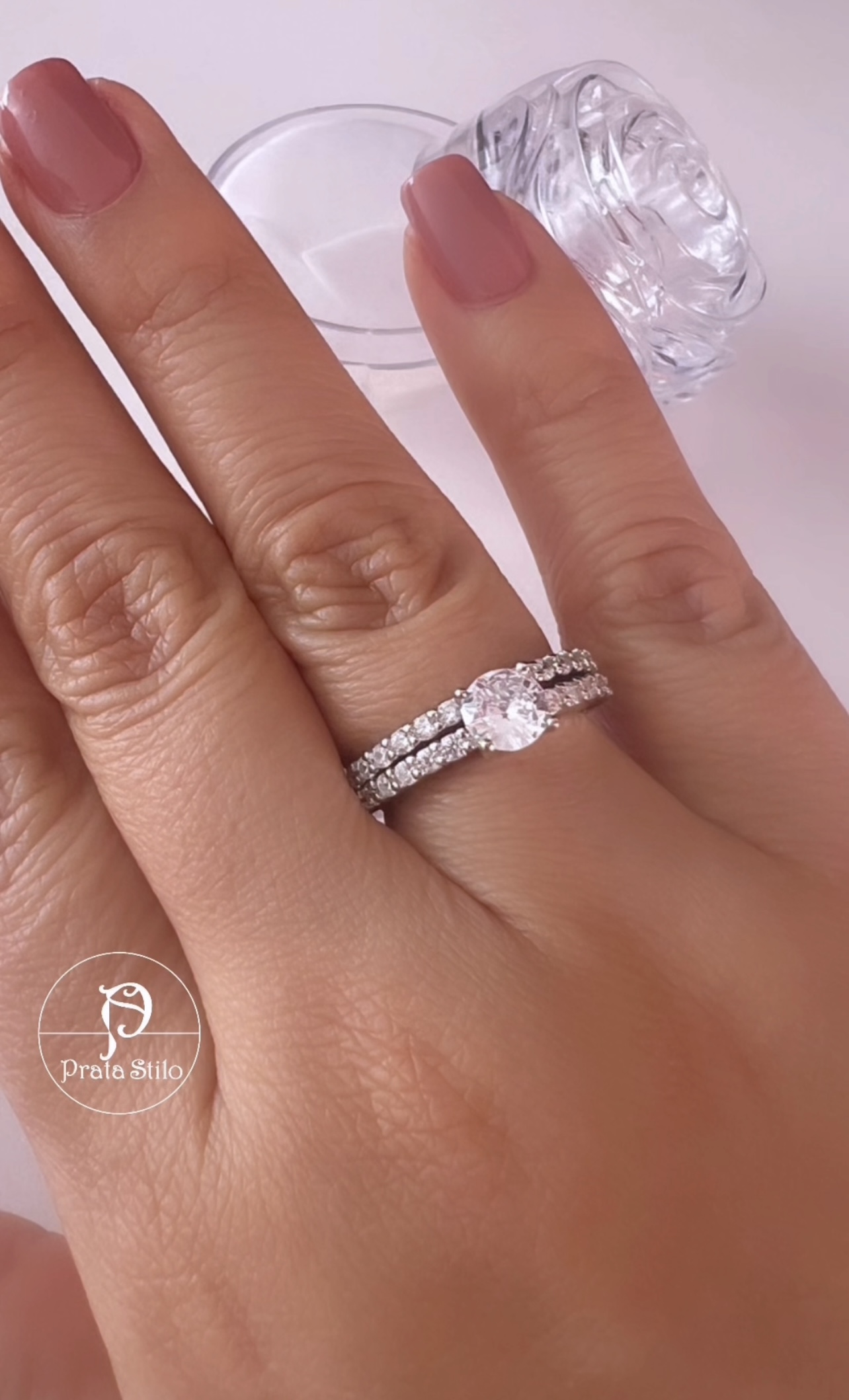 – 1 Anel de Prata 925 solitário com pedras zircônias na lateral ( meio aro )
