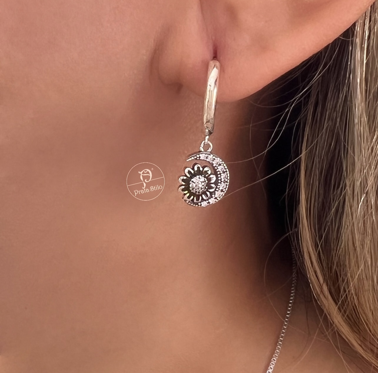 Argola Sol e lua com designer envelhecido com pedras zircônia