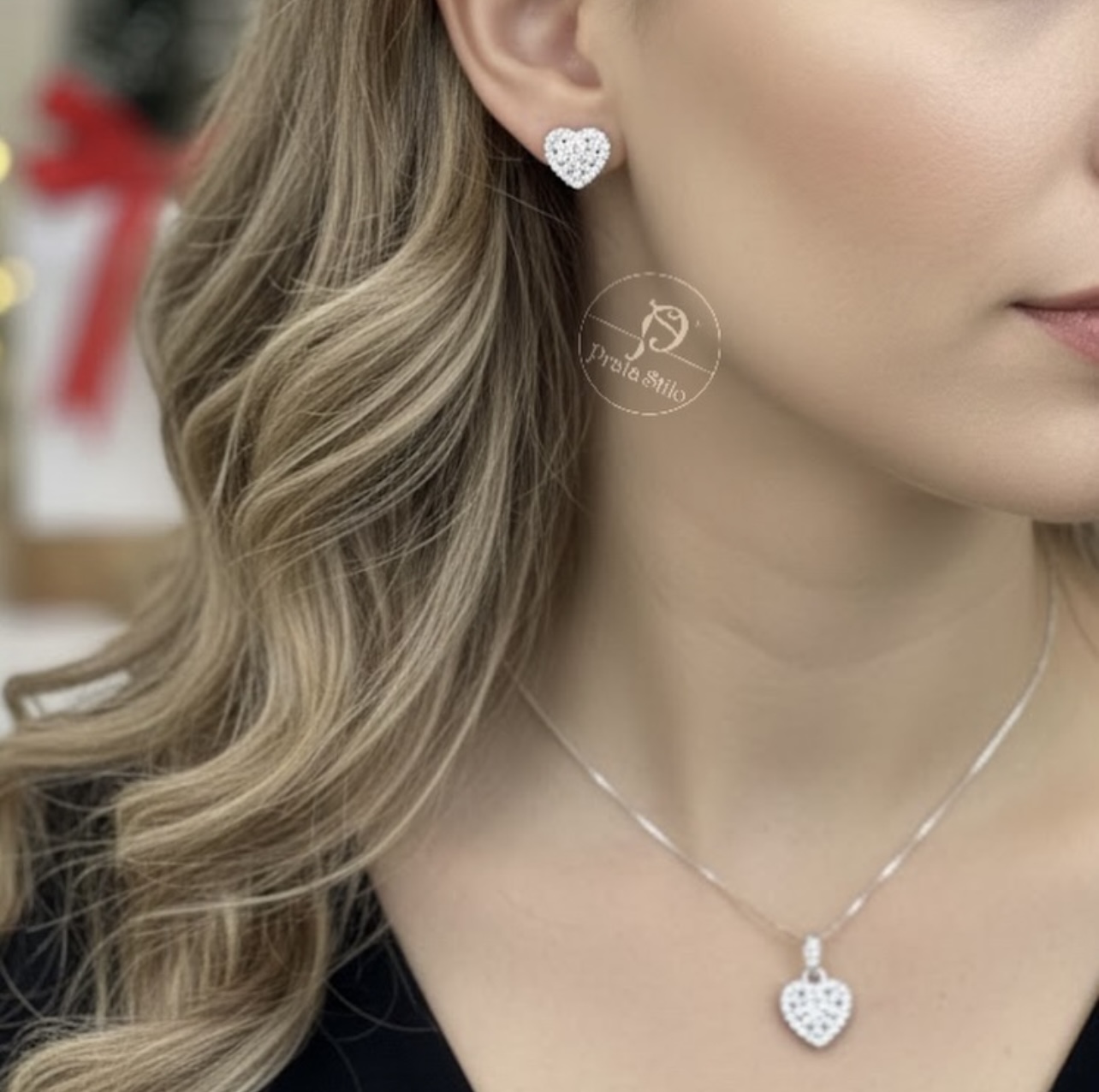 Colar e brinco modelo coração cravejado com pedras zircônia com detalhe também de pedrinhas no aro do pingente