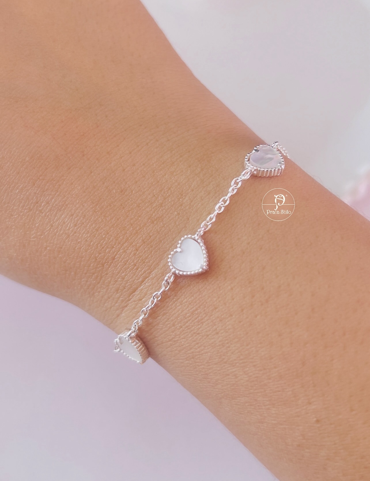 Pulseira modelo elo português com designer 3 coração Madre Pérola